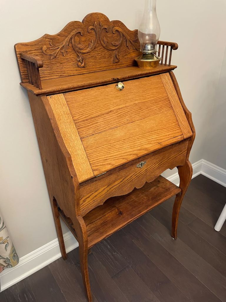 This desk was my grandmother’s Martha Talmadge somewhere prior to 1960. Then handed down to my father William G. Talmadge somewhere in the mid 70’s. I remember this in my bedroom when I’d visit on the weekends. In 2016 my father obviously got this crazy idea to paint it black and I think added the bottom shelf at that time. I can see where a cross brace used to be, now this shelf. He apparently found the wood (pine) for the shelf from something old from the Electric Storage Battery Company (now Exide battery company). He signed the bottom 2016 when he painted it. After inheriting a few years ago and spending more than 30 hours stripping down and oil finishing it, it is now back, close to the origin condition. They don’t make furniture out of solid oak anymore.