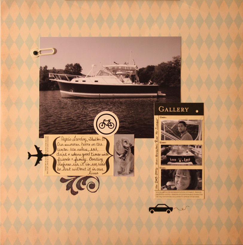 Hey guys, I haven’t posted since emmm . . . the superbowl. So I thought I’d show my latest scrapbook layout of our beloved summer home on the water. The layout features . . . that’s right our boat and the smaller gallery pictures feature the captain, first mate and the ruff ruff. Yes, the dog LOVES to go to the boat. However, when the boat starts moving he wishes he’d stayed on land. Our land lubber furry friend. For real though, he gets extremely stressed and has seizures as a result of it. So needless to say we must go slow with him aboard and stay in calm waters. And the few times we take long trips out into the bigger waters, he must stay home with the house sitter. He gets very upset on those occasions we leave the house with coolers in hand because he knows exactly where we’re going (just because of the coolers). Oh my God dogs are so smart! But he is with us 95% of the time and that is good enough for him, he told me so:-)