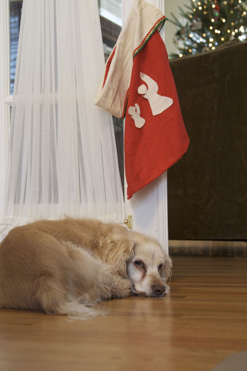 A sleepy dog in the studio OH and the stocking you see here is the stocking Michael was brought home in when he was a baby. For those of you who don’t already know this, Michael was born on Dec 22 (A Christmas Baby).